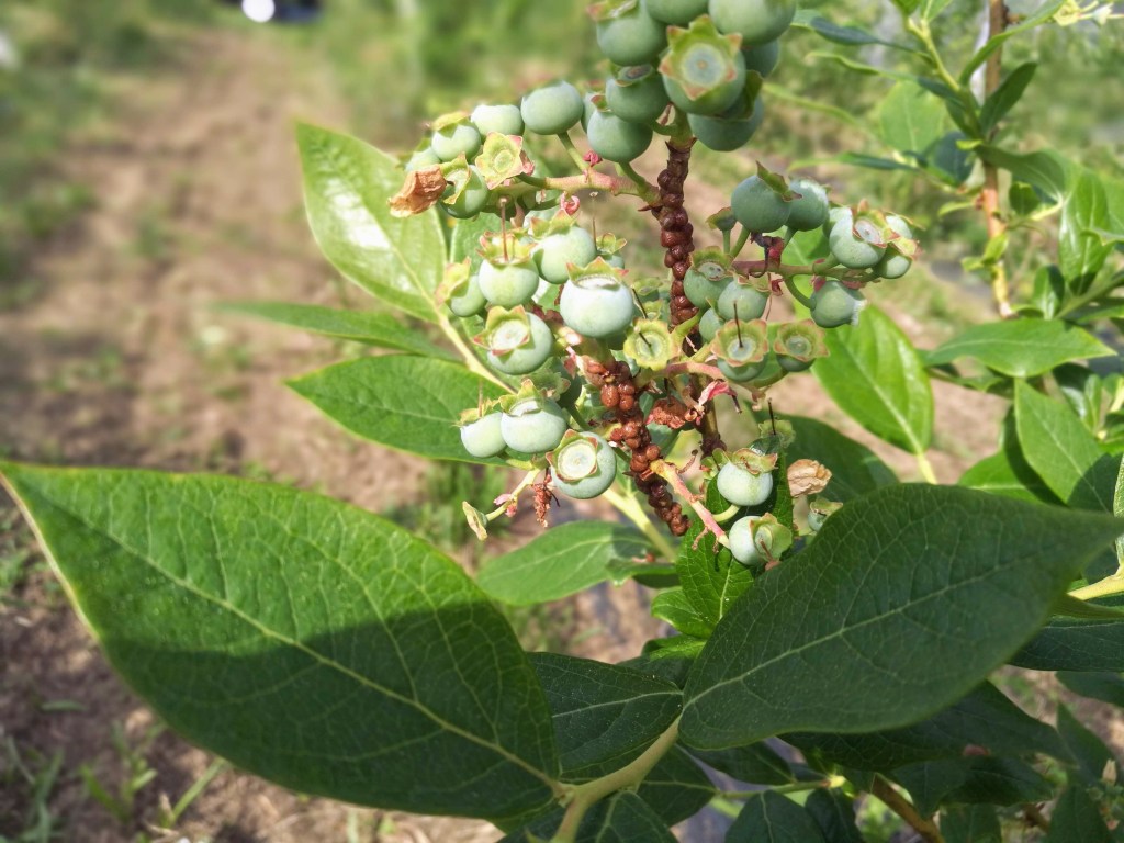 Anche quest’anno qualche giovane ramo di mirtillo (soprattutto Duke) è parzialmente coperto da cocciniglia Parthenolecanium corni.